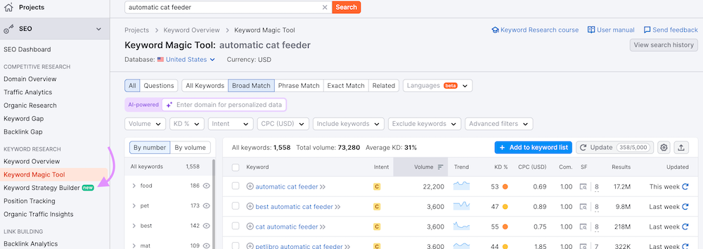 As you can see, the search volume for the keyword “automatic cat feeder” in Los Angeles is 320. CPC stands at $1.08.