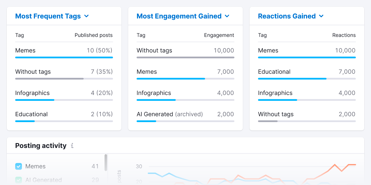 Additionally, you can filter your data based on profiles, timeframes, and post types. The tool’s tagging feature allows posts to be grouped into campaigns or categories for more targeted, data-driven analysis.