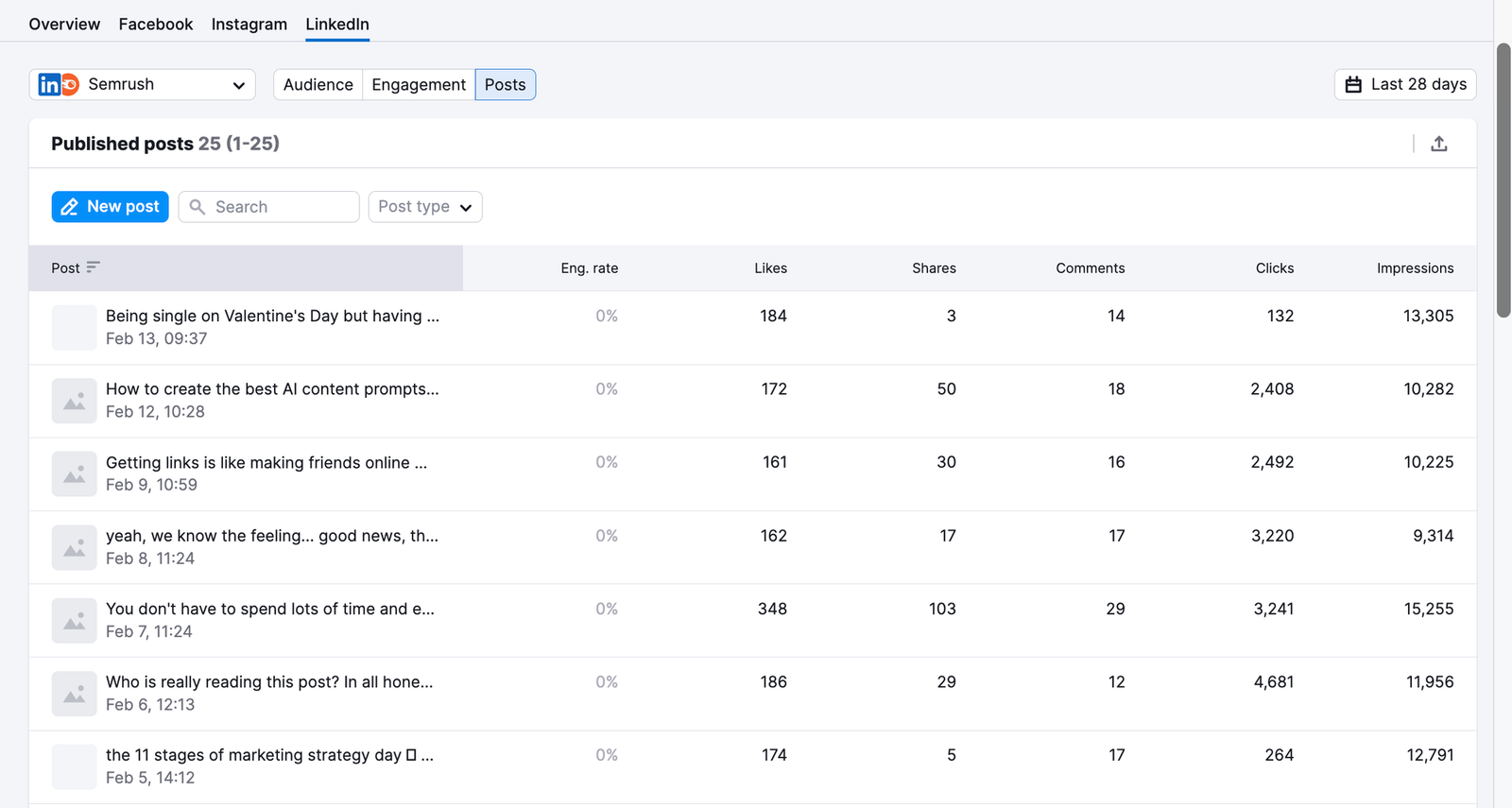 Our Social Content Insights tool also lets you get an overview of your LinkedIn posts’ engagement metrics. Using this tool, you can understand key statistics about your LinkedIn performance all on a single dashboard.