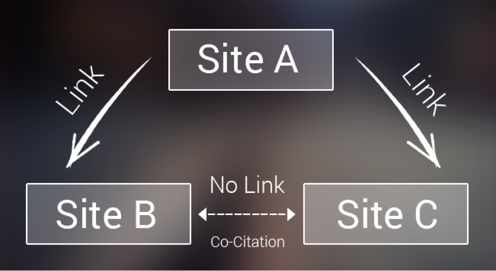 Co-citation is the presence of two different links, A and B, on a website (C), which means that the value of C will pass through to A and B. Co-citation also goes a step further to dictate that link A and B will form an interrelationship and pass some value by association to one another. Co-citation establishes a relationship between the A and B websites that aren't directly linked together, but do appear together on web page C.