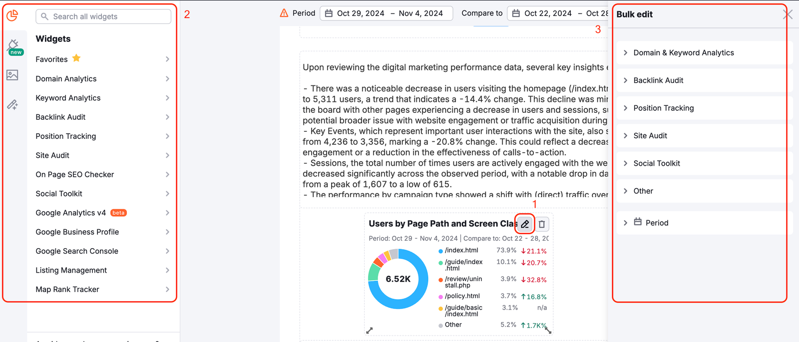 Now you’re all set! If you feel that something needs to be changed at this point, feel free to customize your reports and delete or edit the existing widgets (1), add new ones (2), or use the Bulk Edit feature (3) to manipulate multiple datasets at once.