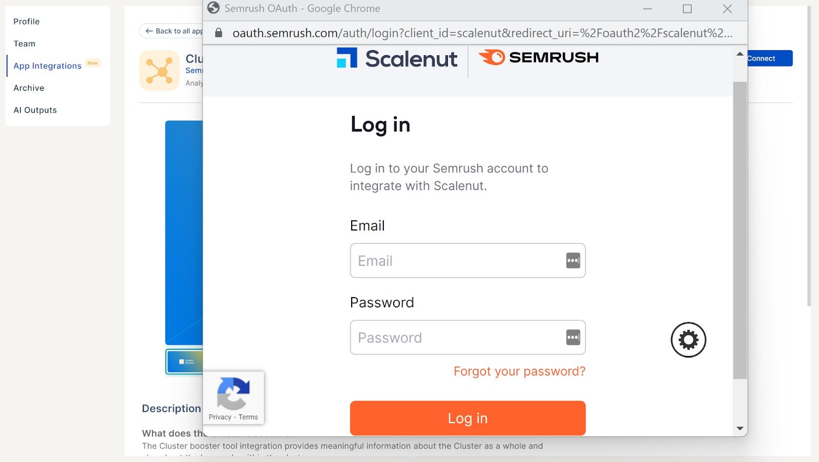 This will take you to the Cluster Booster homepage. Click “Connect” in the top right corner, and you will be asked to provide your Semrush account details.