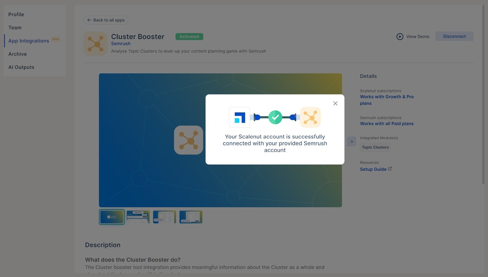 Cluster Booster supports Scalenut’s Topic Clusters tool by integrating SEO data from Semrush.