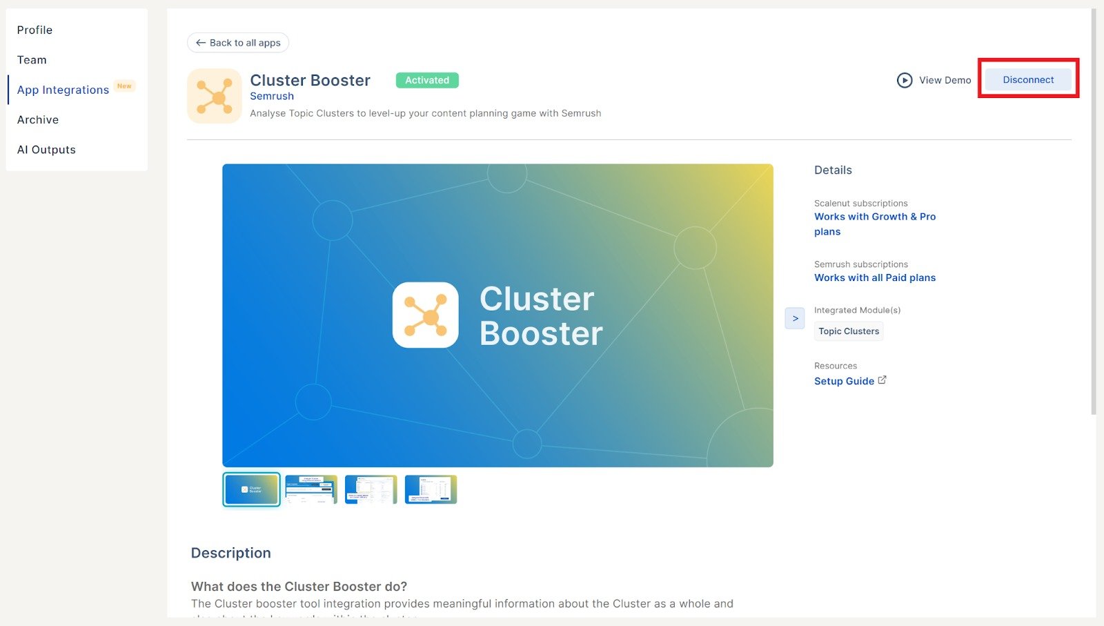 Note that you can disconnect the integration at any time by selecting “Disconnect” in the top right corner of the Cluster Booster page.