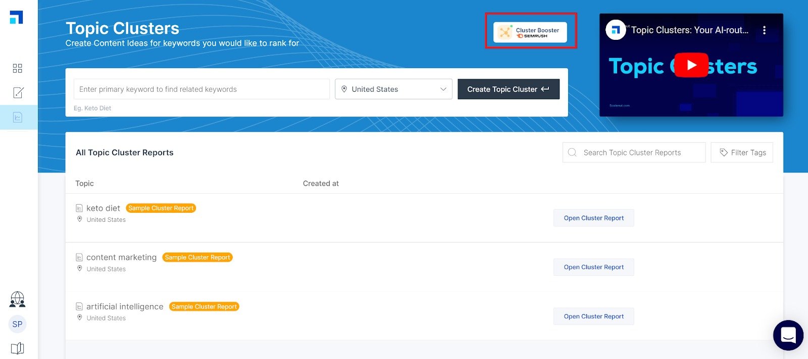 To use Cluster Booster in Topic Clusters, first create a cluster report. You can learn how to do this here.