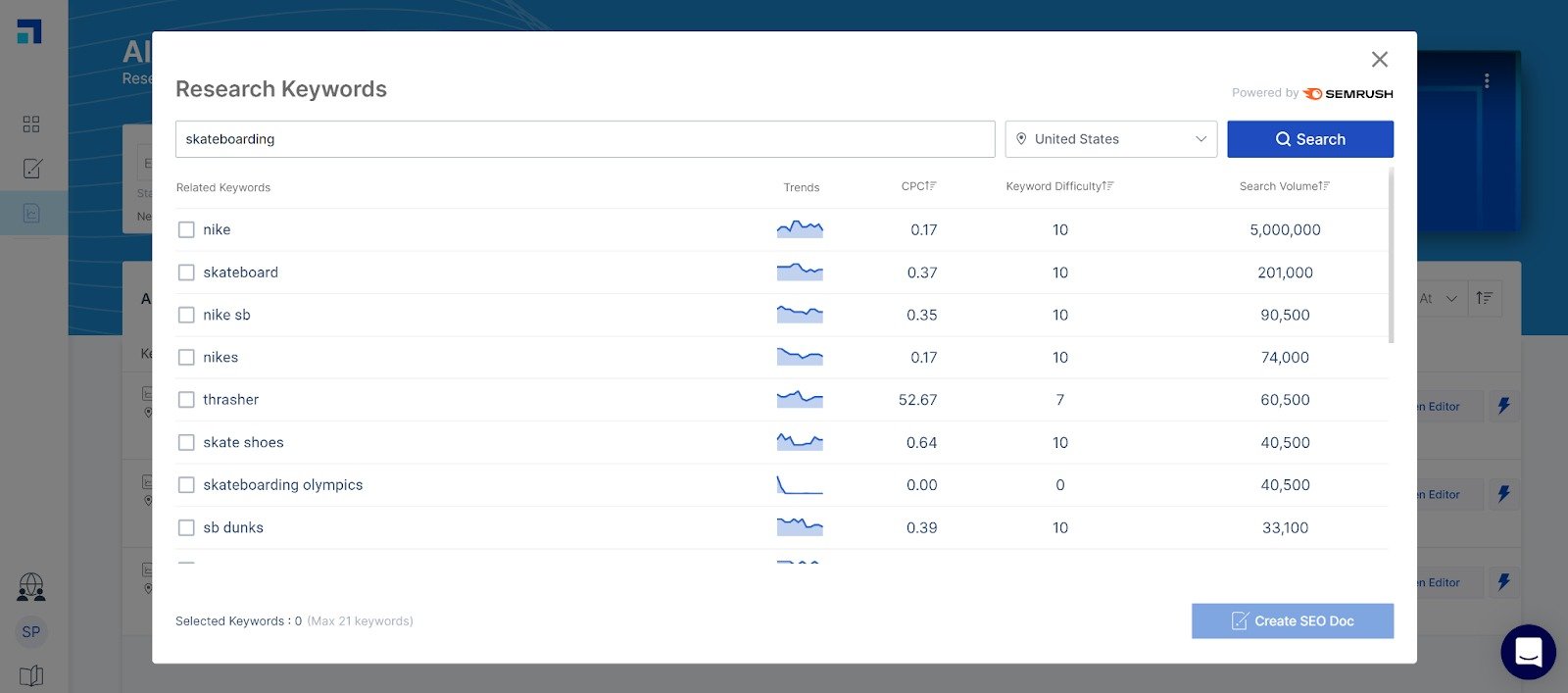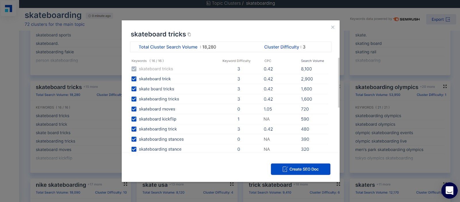 You can integrate Scalenut and Semrush at two points: the Topic Clusters tool (Cluster Booster) and SEO Docs (Keyword Researcher).