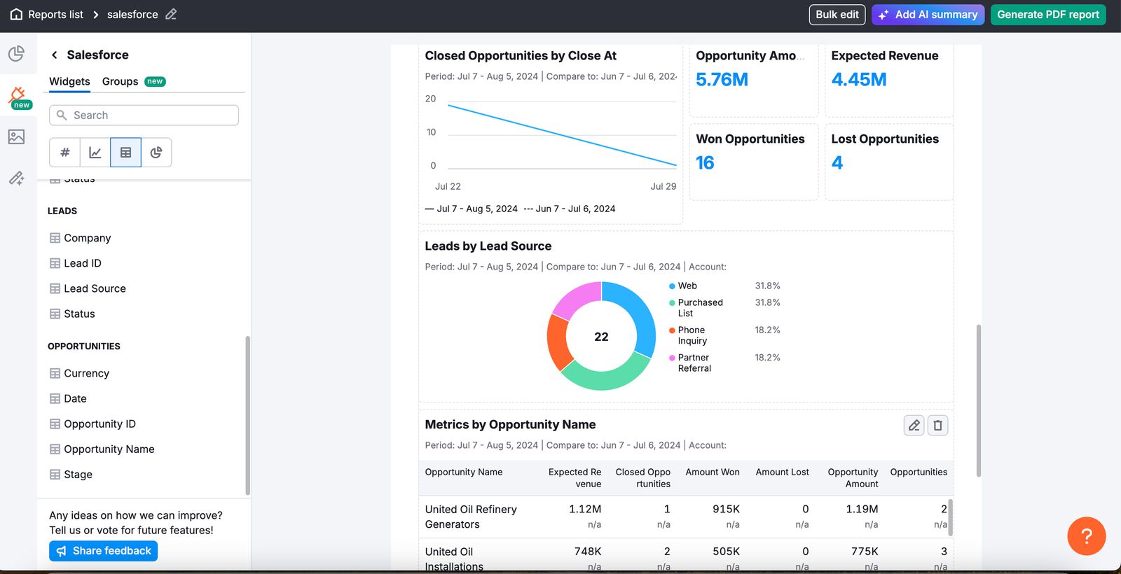 Integrating Salesforce CRM in My Reports allows businesses to monitor sales performance, track customer interactions, and analyze pipeline activity. With insights into lead conversions, deal progress, and revenue trends, brands can gain a clearer understanding of their sales operations and customer relationships.