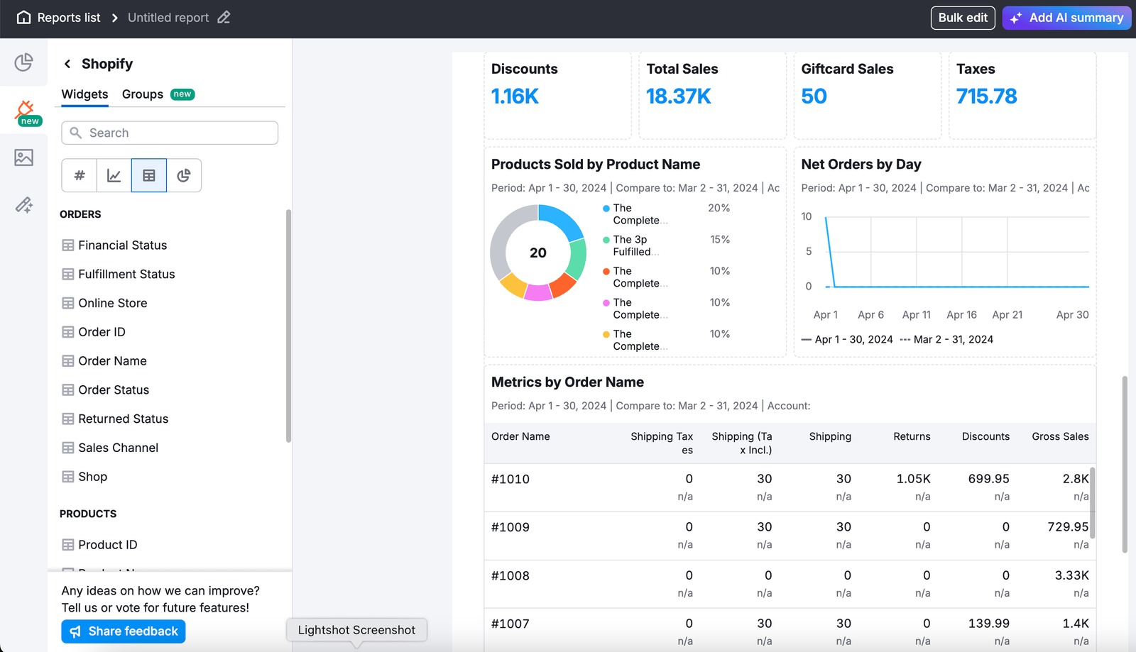 Also, Groups are available in the Integrations. With Groups, you can add several widgets with one click, grouped by product task or business area. Widget Groups make the report creation less time-consuming and simplify the flow of creating a report from scratch.