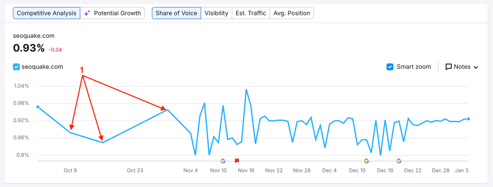 We track daily results in Position Tracking for 60 days. After 60 days we display information using weekly points (1) and by default, those are on Wednesdays. We keep this weekly information for 140 weeks.